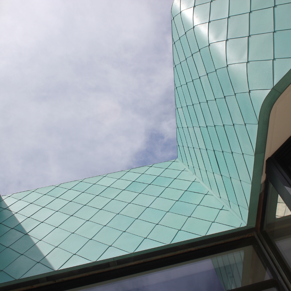 Copper is valued for its exceptional service life, clean workability, and distinctive natural patina. Over time, it develops rich tonal depth that adds warmth and character to both contemporary architecture and heritage buildings.